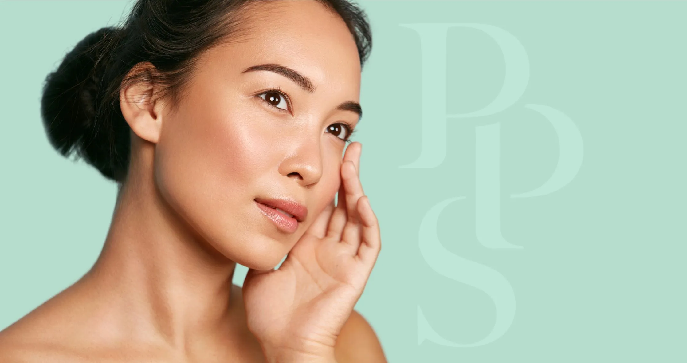 Smiling young woman with curly hair resting her hand on her cheek, showcasing clear skin and a joyful expression. She is wearing a black strapless top against a neutral background. The image highlights beauty and confidence, suitable for beauty and skincare content.